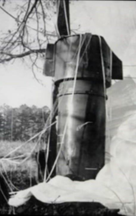 On the night of January 23, 1961, a B-52 bomber radioed back to Seymour Johnson Air Force Base in Goldsboro with a problem: it had a fuel leak in one of its wings. As it was coming back in for a landing, the wing broke off. Five of the eight men on board were able to bail out, including Lt Adam Mattocks (who died in 2018). As the plane fell from the sky, it started to break apart, and two thermonuclear bombs on board fell out. In the chaos, several systems on the bombs activated themselves. On one, the parachute deployed, and it drifted down gently to the ground, coming to rest against a tree.