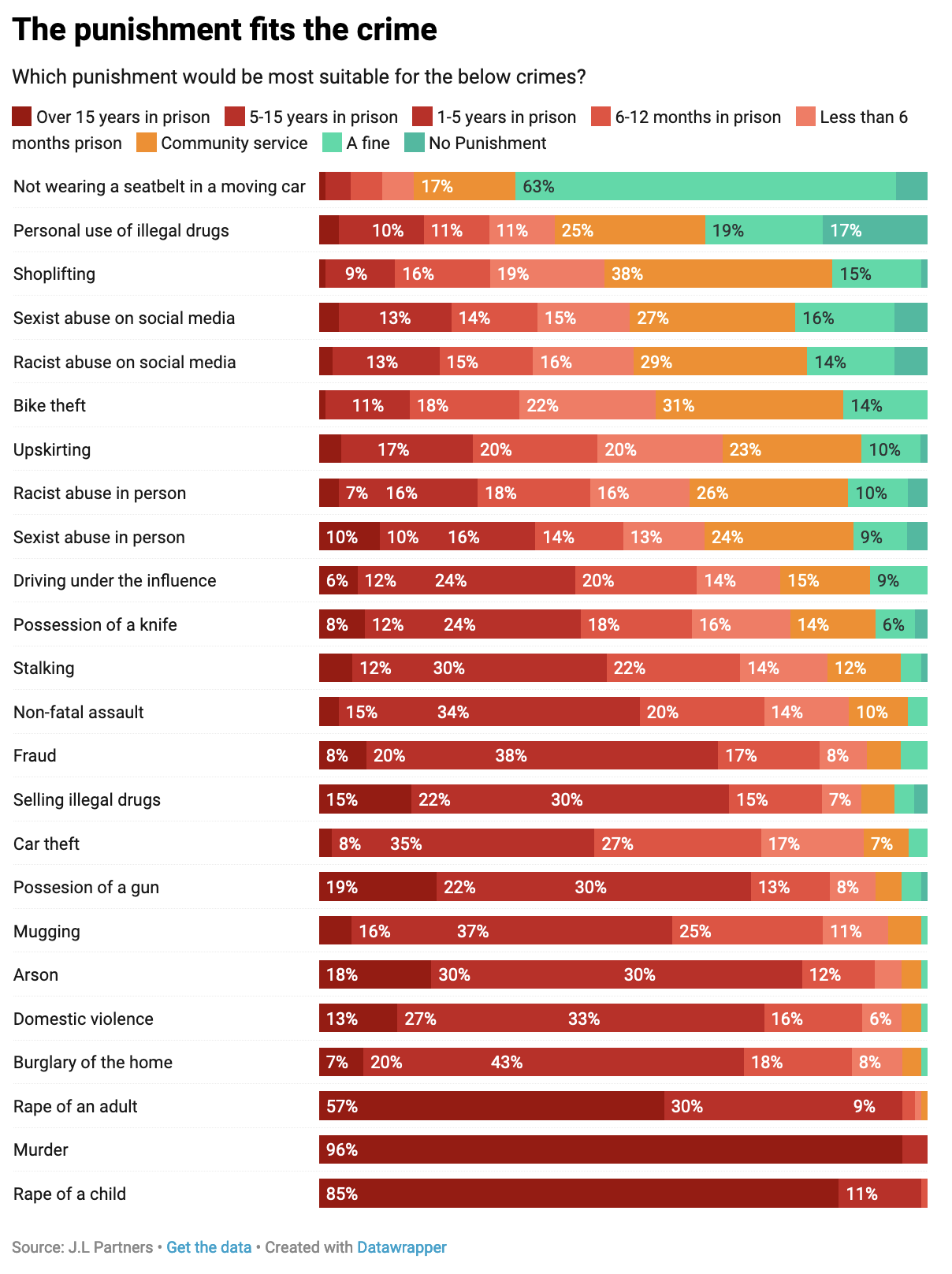 Last week, J.L. Partners asked British adults which punishment – from a fine to a prison sentence of more than 15 years – would be most suitable for 24 different crimes. On the graph below every punishment that involves jail time is a shade of red. Amber is community service, while green is a fine. Dark green indicates no punishment at all.