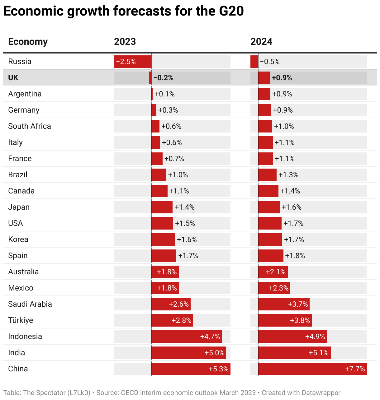 First the good news. Unlike the IMF, which predicted in January that the UK economy would have a worse 2023 than even Russia, the OECD’s latest forecast has Britain outperforming Russia. Now the bad news: the OECD still predicts the UK to perform worse than any European country other than Russia.