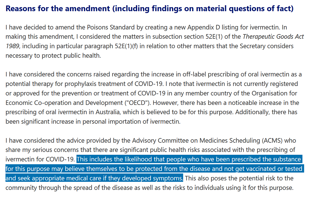 On September 10, 2021, a delegate of the Secretary of the Department of Health considered the advice provided by the Advisory Committee on Medicines Scheduling (ACMS) and made the decision to amend the Poisons Standard by creating a new Appendix D listing for ivermectin, and thus eliminated its use as an off-label treatment option for Covid. This occurred with reference to subsection 52E(1) of the Therapeutic Goods Act 1989, in particular paragraph (f), which empowers the Secretary to act on any other matters that the Secretary considers necessary to protect public health.