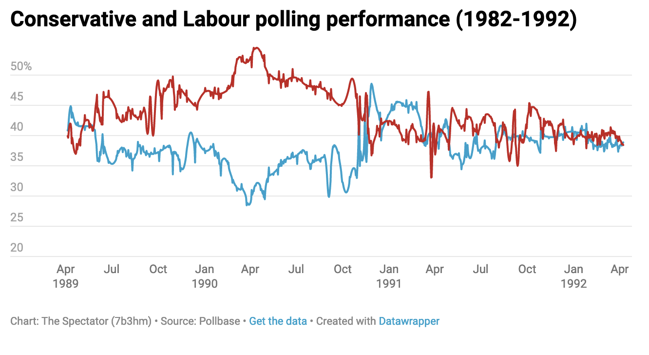 In the run-up to that general election, the Conservatives had been trailing Labour for 530 days with their lead reaching 25 percentage points in the spring of 1990. Margaret Thatcher had recently been removed from power, the salmonella egg scare had just happened, the poll tax chaos had caused a haemorrhage in voter support, Labour had picked up seats in by-elections and chancellors Nigel Lawson and Geoffrey Howe had resigned.