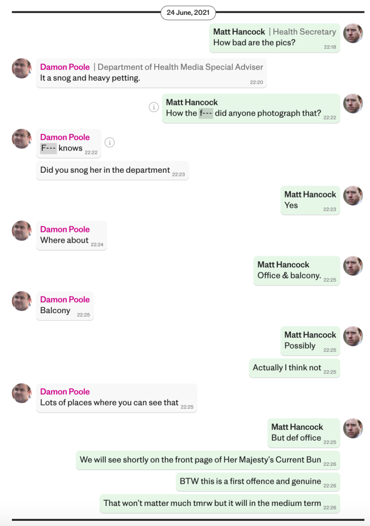 Hancock then set up a WhatsApp group called ‘Crisis Management’ with his media adviser Damon Poole and his lover Coladangelo. He said that he ‘need[ed] to find a clinician’ to say that he broke guidance, not guidelines. ‘PLEASE STAND THIS UP’, he wailed to his advisers.