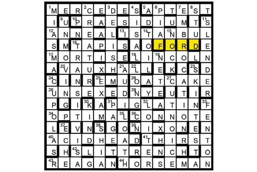 The theme word was FORD (in line 4), and the sets of unclued lights were 1A, 20, 21 (makes of car), 18, 39, 43 (US presidents), and 11, 31, 33 (characters in The Merry Wives of Windsor).
