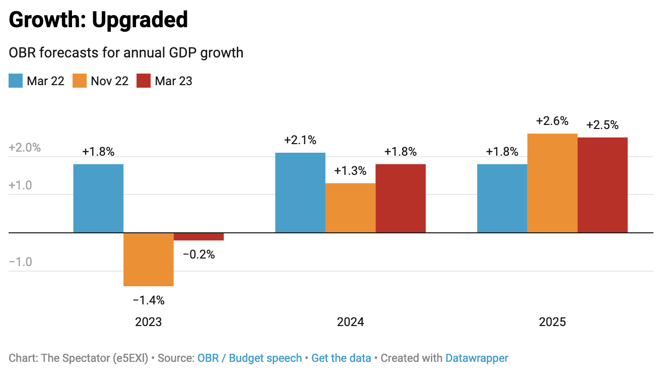 - The Chancellor began with good news: no recession. The UK economy will avoid a technical recession this year. The country’s economy will shrink by 0.2 per cent but this does not meet the two consecutive quarters definition accepted by economists.