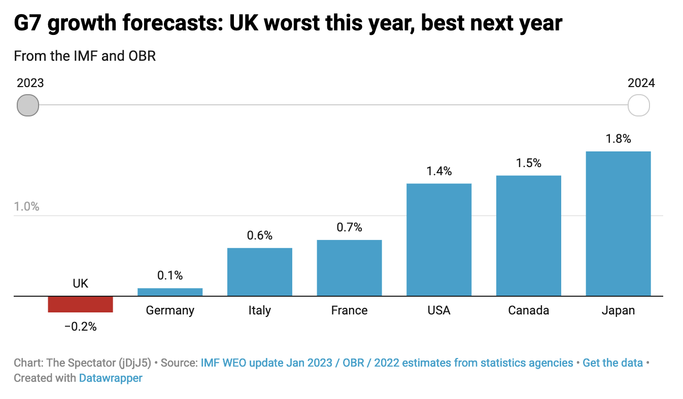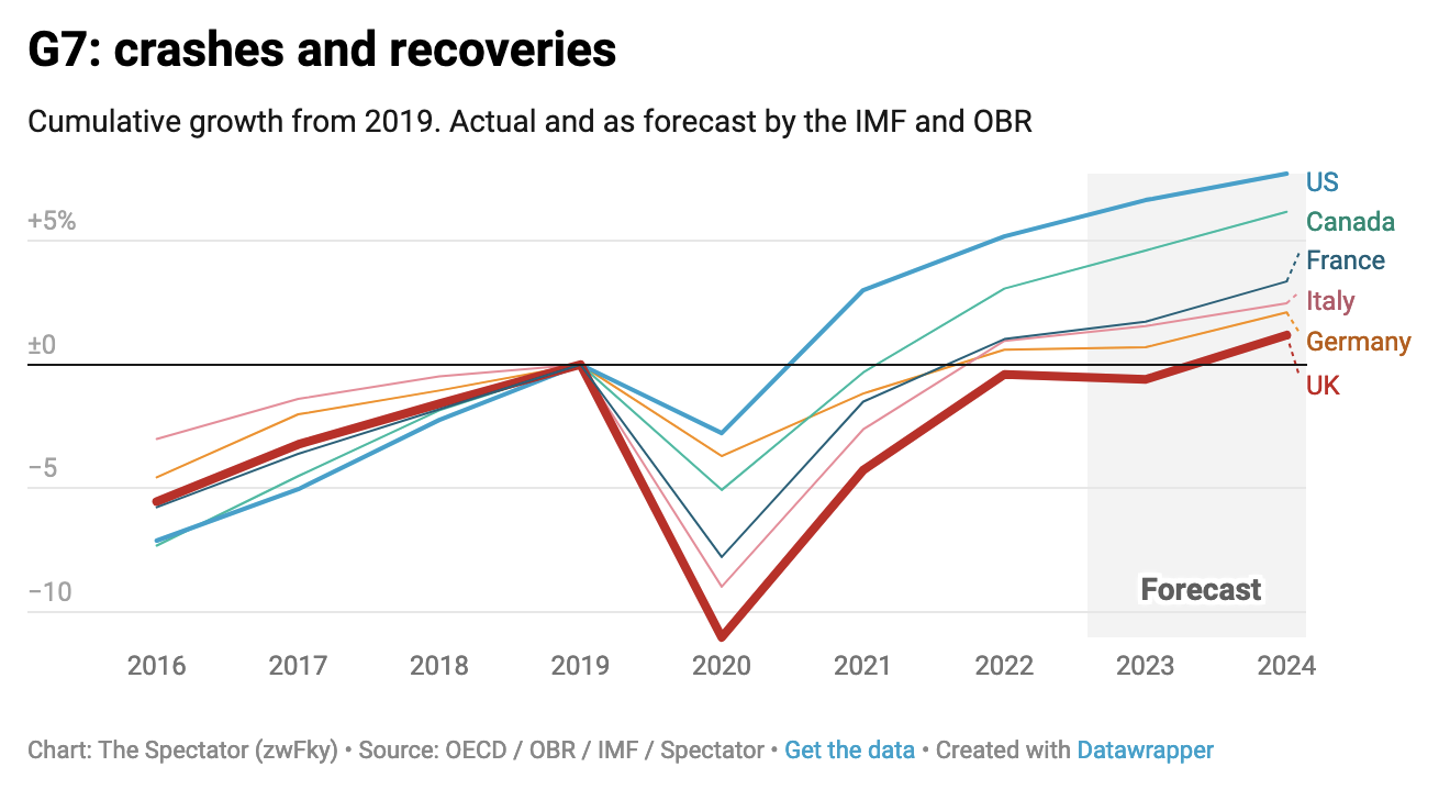 - The UK is forecast to have the worst growth in the G7 this year but the best next year. Single year growth will go from being the worst in the G7 to the best over the next two years, according to the OBR.