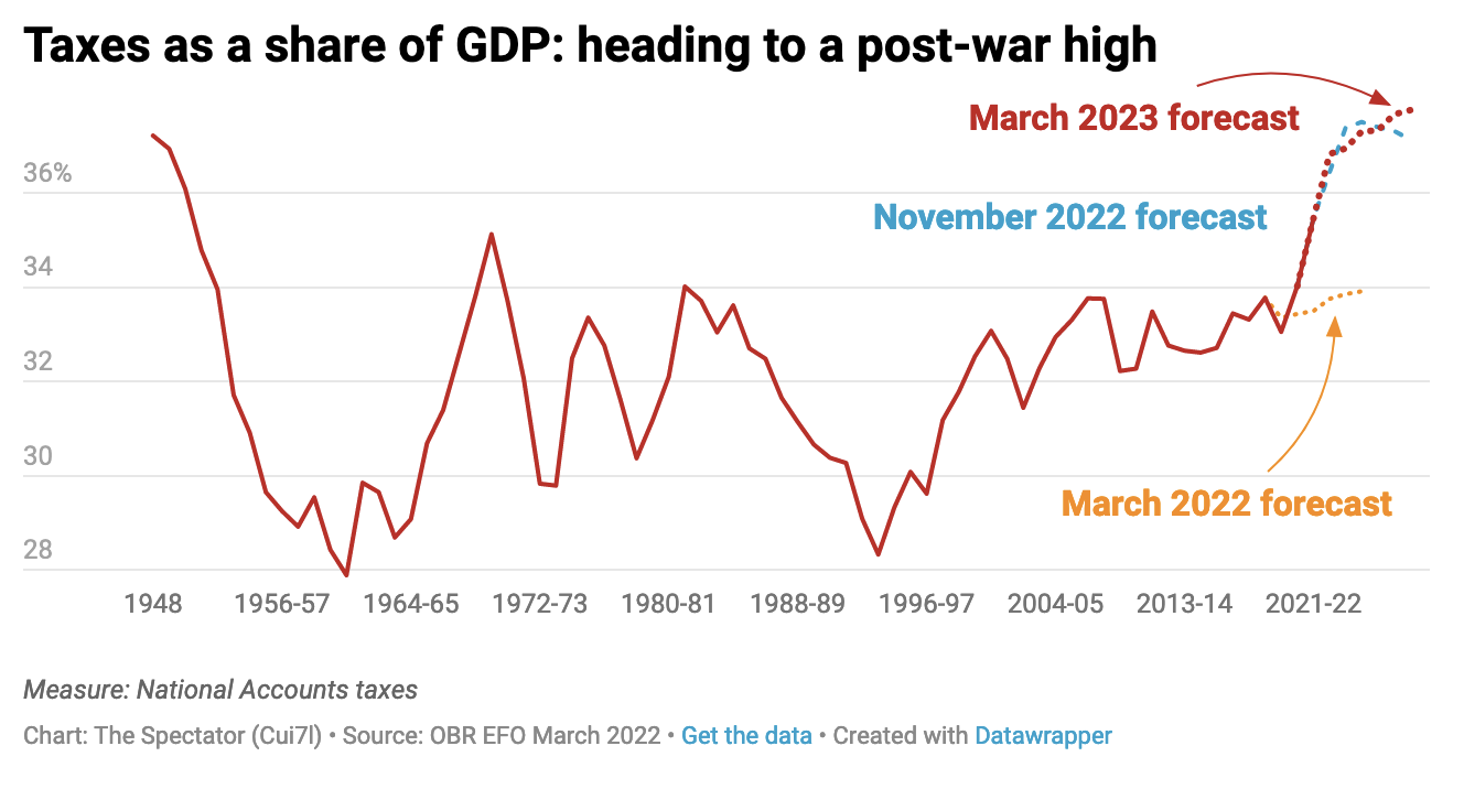 - The tax burden continues to climb and will reach a 75-year high in 2024-25 – and it will keep rising. Britain is now a big state, and big states need a lot of taxes. Public spending as a share of GDP is due to settle at 43.4 per cent. The OBR calls this: ‘the highest sustained level since the 1970s.’