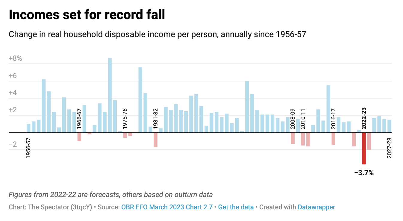 - Living standards face their worst fall since the 1950s. The OBR’s estimates for real gross domestic income have slightly improved on the November forecast but they still mean the worst fall in living standards for generations.