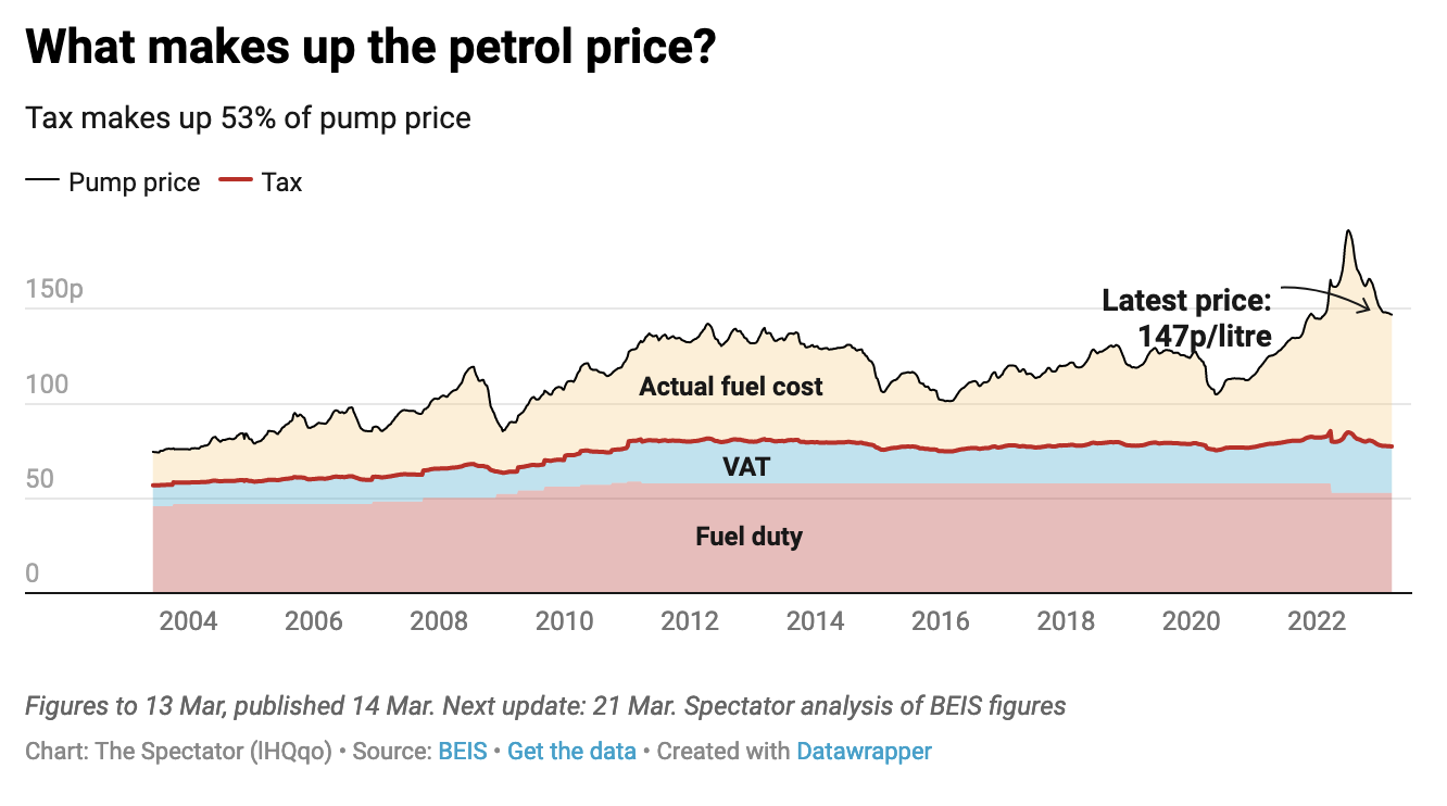 - Fuel duty has been frozen and the 5p cut announced last year has been extended. This will be a help to motorists who have seen prices at the pumps fall 23 per cent in recent months to 147p per litre. However the taxman is still to blame for over half of that amount.