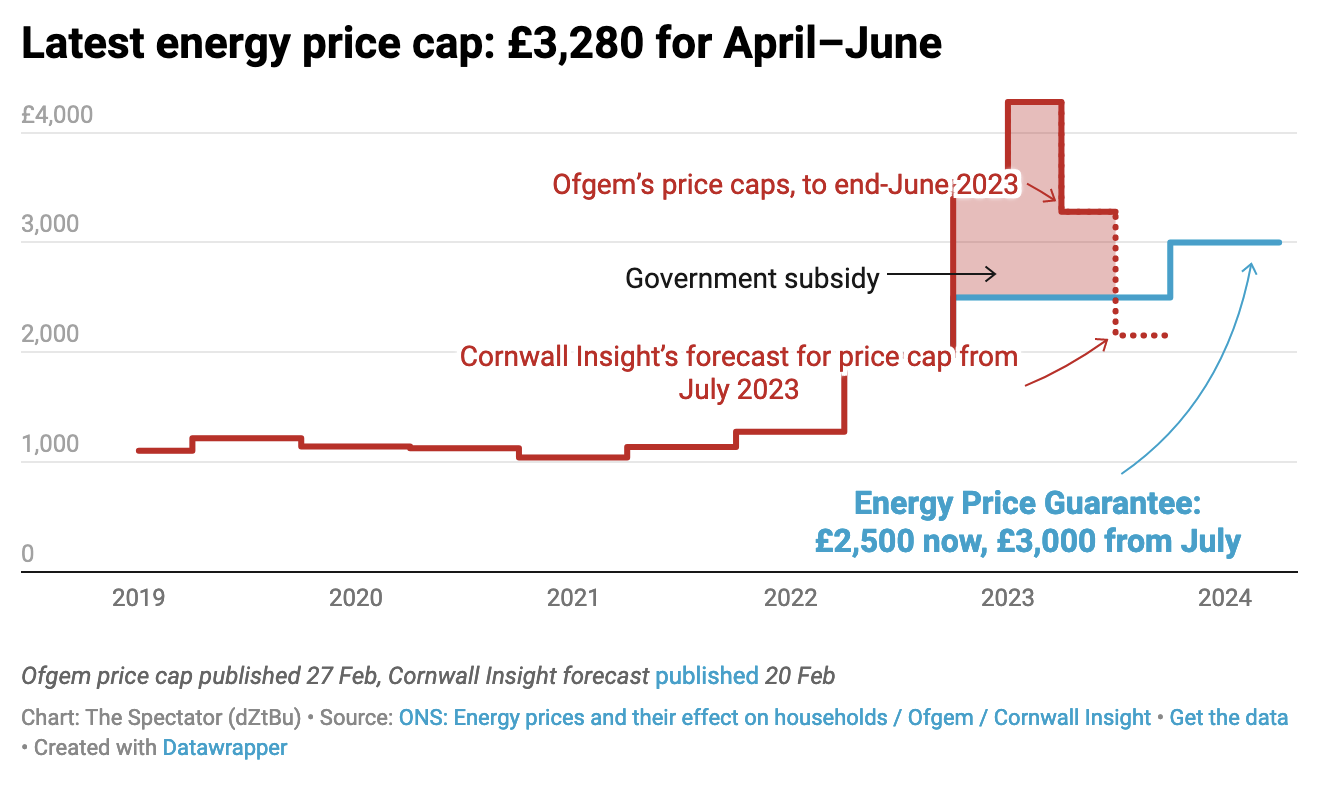 - …But it’s effectively costing the government nothing because gas spot and future prices have collapsed. Prices have been falling for months and the energy cap is now forecast to fall to just over £2,000 in July. As a result it’s unlikely the Treasury will have to fork out for the energy guarantee much longer.