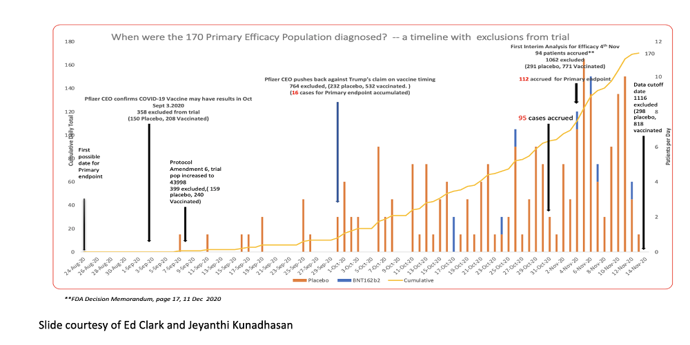 When Pfizer’s CEO said on Sept 3, 2020, that there would be late-stage trial results October of that year, there were no eligible cases accrued, as far as we can tell. He pushed back on October 1 against politicisation of the vaccine development seen during the Presidential debate on September 29, pledging to submit a vaccine for approval only after it has gone through the appropriate trials.