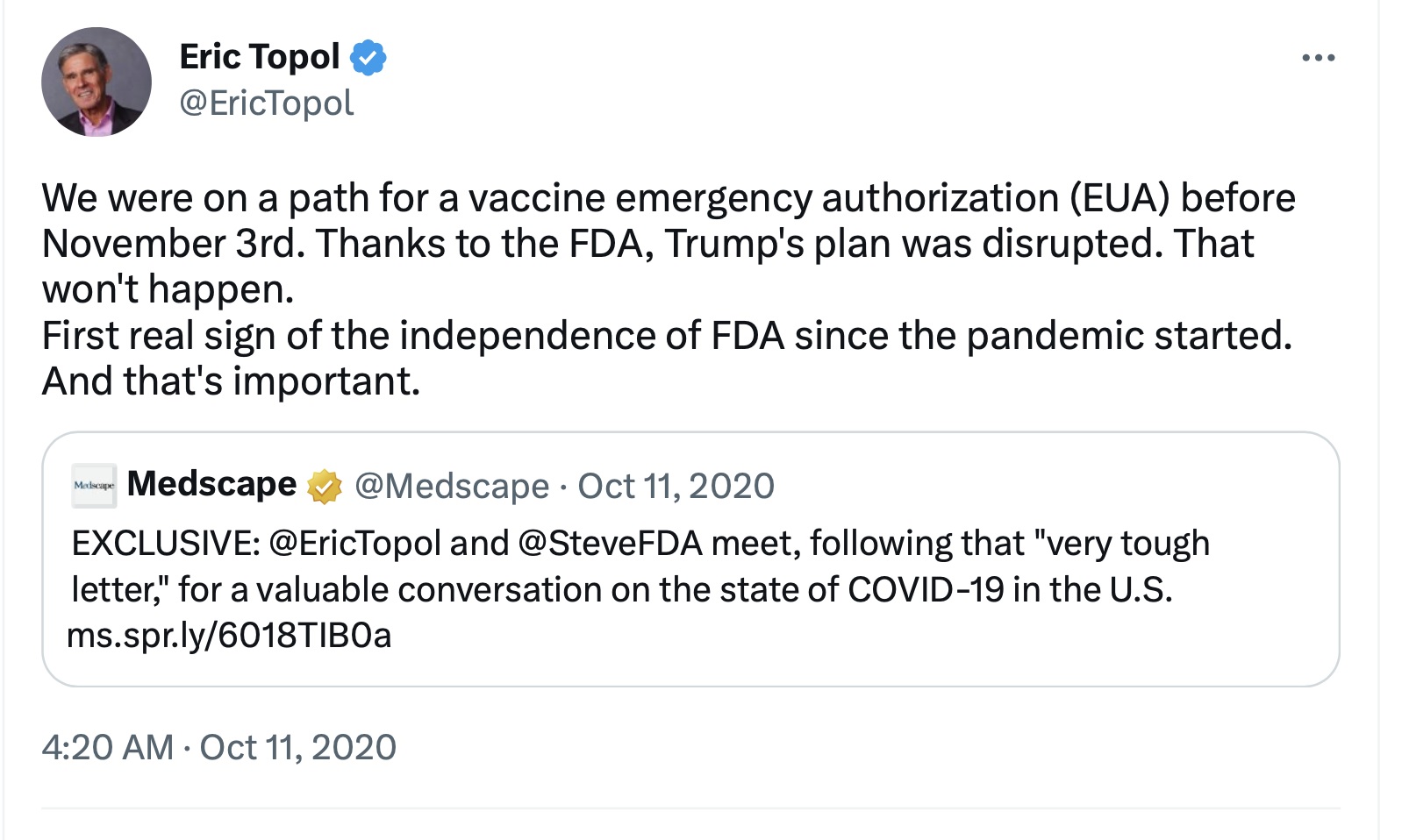 ‘…a heart expert and researcher with a huge Twitter following of his own, was already weeks into a personal campaign to make sure the administration could not rush a Covid-19 vaccine through regulatory authorisation before Election Day on November 3 … developing an effective vaccine against Covid-19 is “the biggest event in our generation” and one that should be evaluated on the basis of scientific data, not political implications.’