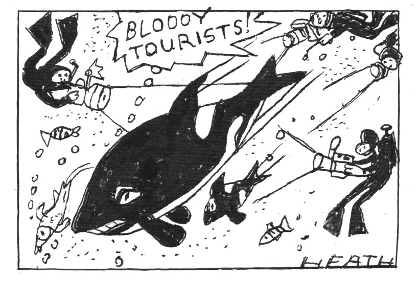These different populations are called ecotypes and they don’t mix. (There are perhaps five different ecotypes in the Antarctic.) All orcas have the equipment to feed on each other’s preferred food, but they don’t even try. They stick to their own tastes and their own kind. They are very picky about it — captive animals of one ecotype have been known to refuse unfamiliar food to the point of starvation.