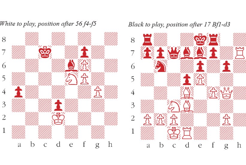 This diagram shows the position after the advance 56 f4-f5, with Jan Petr (Cambridge) playing White. Striving to win the game, he has advanced his pawn to f5 instead of capturing the pawn on d3 (which led to a straightforward draw).