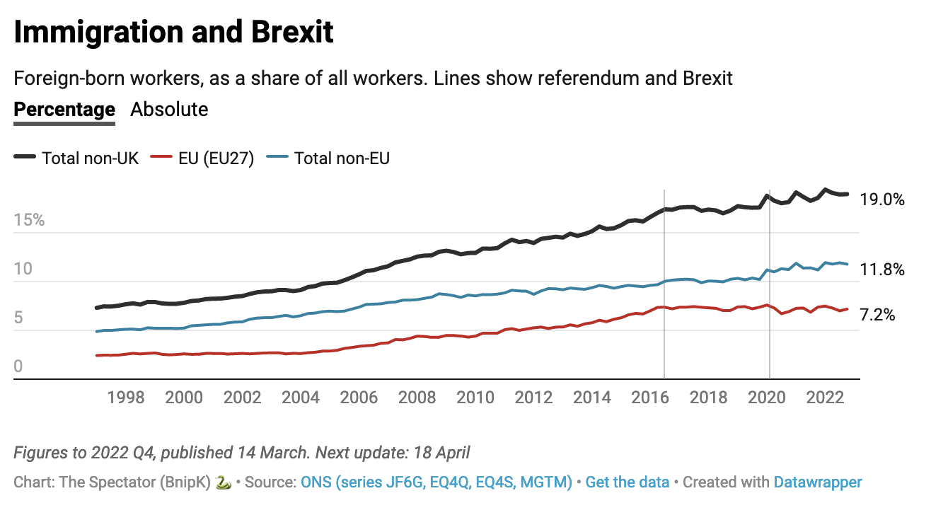Add to the above the 10,000 from general welfare reform, you get 110,000 in total. But that’s not where Sunak is going to get most of his new workers from. The OBR says that we’ll end up importing far more workers than we’ll recruiting from the tanks of the unemployed with 160,000 more (!) than it was expecting just four months ago. It stresses these are extrapolations, not forecasts. But on the post-Brexit immigration evidence so far, it says, we can expect a lot of new arrivals – but no more likely to contribute to the economy than those already in the country. At present, immigrants make up about 19 per cent of all UK workers: this ratio may steadily increase.