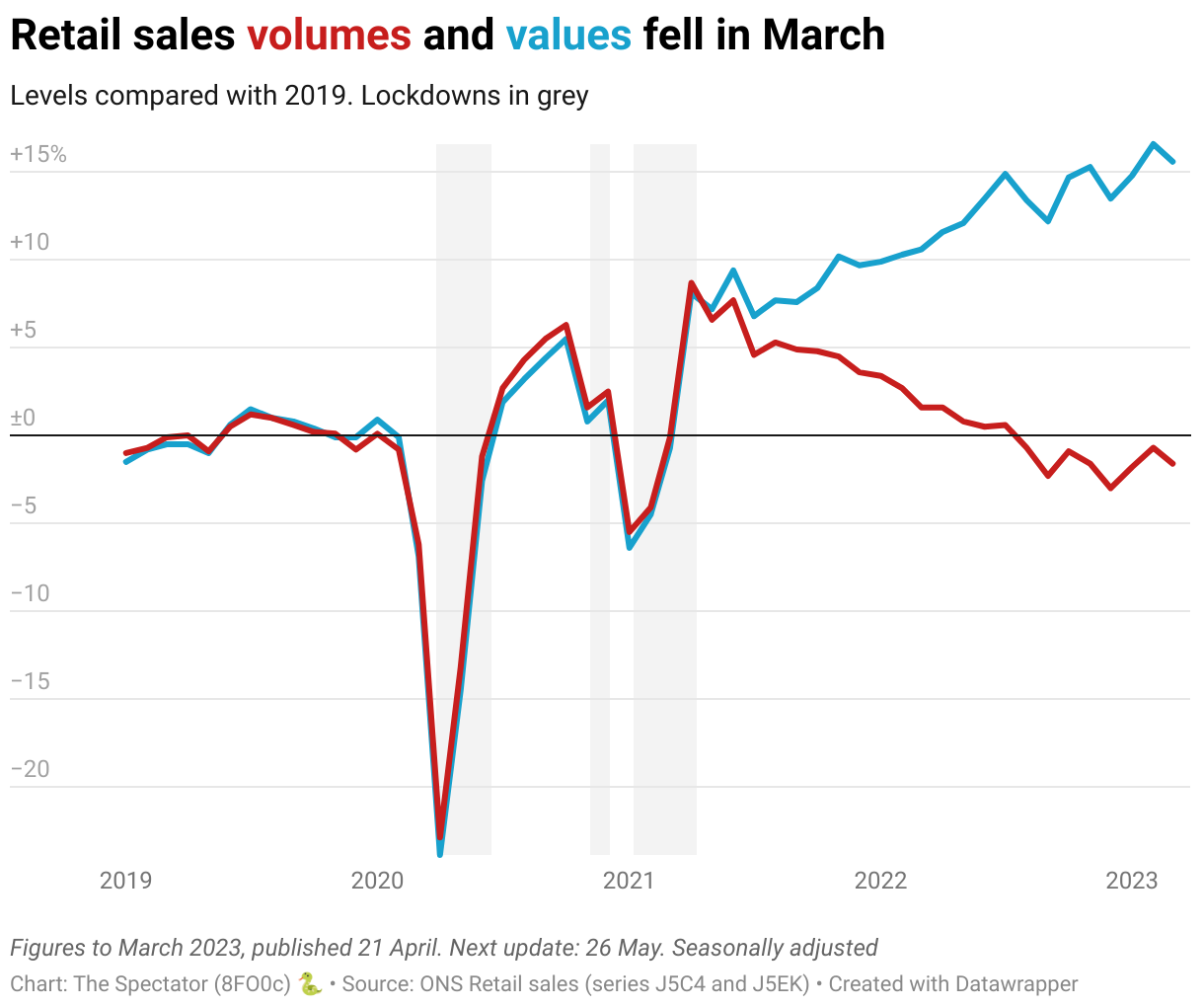 April has seen pretty lousy weather so far, too, but if the sun does come out in May, don’t expect too much of a rebound in sales. February’s unexpectedly strong rise in sales is looking a bit of a statistical blip. We are unlikely to see a genuine recovery in retail activity until inflation and interest rates embark on a lasting fall which restores real-terms buying power.