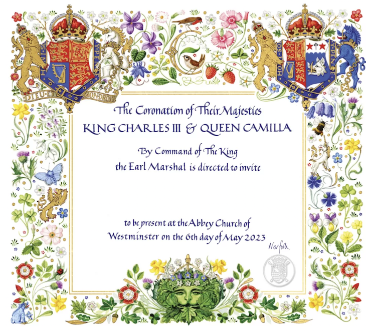 Yet if she saw what her son had come up with, she might have gasped with surprise, and then smiled in wry recognition. The invitation – designed by the heraldic artist Andrew Jamieson – is a riot of colour and celebration. Amongst the many items depicted is everything from the four national flowers of the United Kingdom – the rose, shamrock, thistle and daffodil – to the coats of arms of both King Charles and Queen Camilla. The invitation pointedly invites the guests to the coronation of ‘their Majesties’; it is clear that this will be a dual monarchy, rather than the constitutionally unequal relationship between Queen Elizabeth and Prince Philip, something that rankled throughout their marriage.