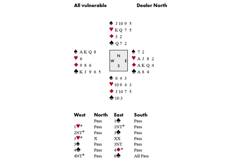 [1♥ = ♠, 1NT = 17-19, 2NT = transfer to ♣, 3♥ = shortage; 4◆ = keycard, 4NT = 2 without the Q♣.]