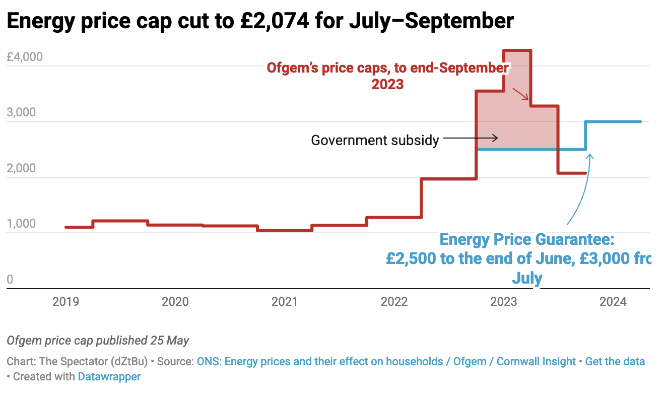 So much for price-fixing. The energy price cap is finally set to fall, with the result that the average household should have to pay no more than £2,074 a year for its energy from 1 July.