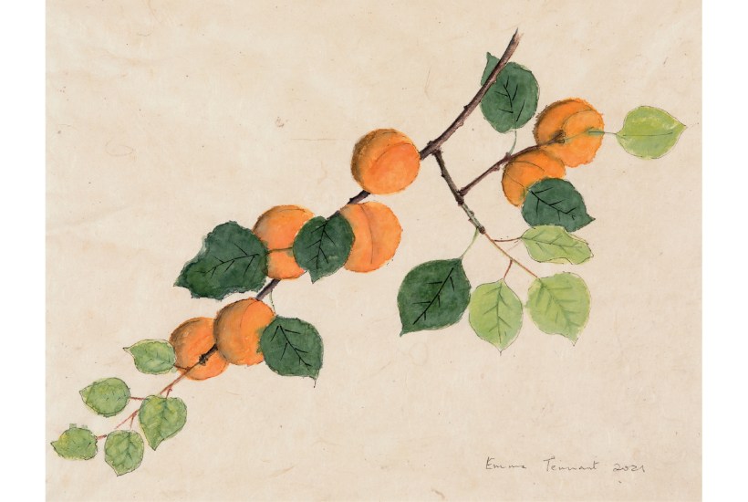 An apricot, Prunus armeniaca, is shown on the edge of blossoming (see below), with buds straggling along leafless branches that are half gleaming old wood, half fresh green wood. The blossoming branch is one of several nods to the elegant starkness of Chinese and Japanese botanical art and the oriental love of flowers erupting from leafless branches. ‘I like the idea of the garden growing,’ Tennant explains. ‘Most painters just do the finished product, the perfect rose, the perfect lily. I like it when things are just bursting into life.’ And then we meet the apricot again, later in the year, with its soft, buttocky fruit begging to be plucked. The spring apricot branch was painted in the unheated, derelict greenhouse at The Glen, the Tennant family home near Peebles, where the plant flourishes at an altitude of 750ft. The fruiting autumn specimen was grown by a local friend, near Langholm.