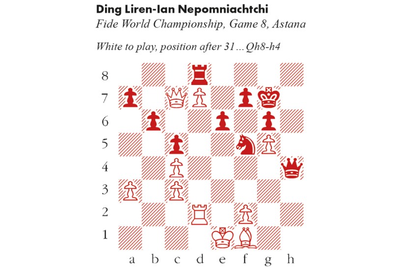 Ding was philosophical in victory, noting how narrow was the margin, but how divergent were the consequences for his life. His lowest moment came after the eighth game (below), in which he passed up a golden opportunity to level the score. He was contemplating retirement if he lost the match, but after winning he expressed his intention to build a strong team and become more professional in his approach: at several moments he had looked far less ready than Nepo for the rigours of world championship matchplay. But Ding paid tribute to his second in Astana, Richard Rapport, whom he credited with infusing creativity into his opening play. Ding was particularly ambitious at the start of game 8, and in the position below his powerful d7 pawn gives him a large advantage.