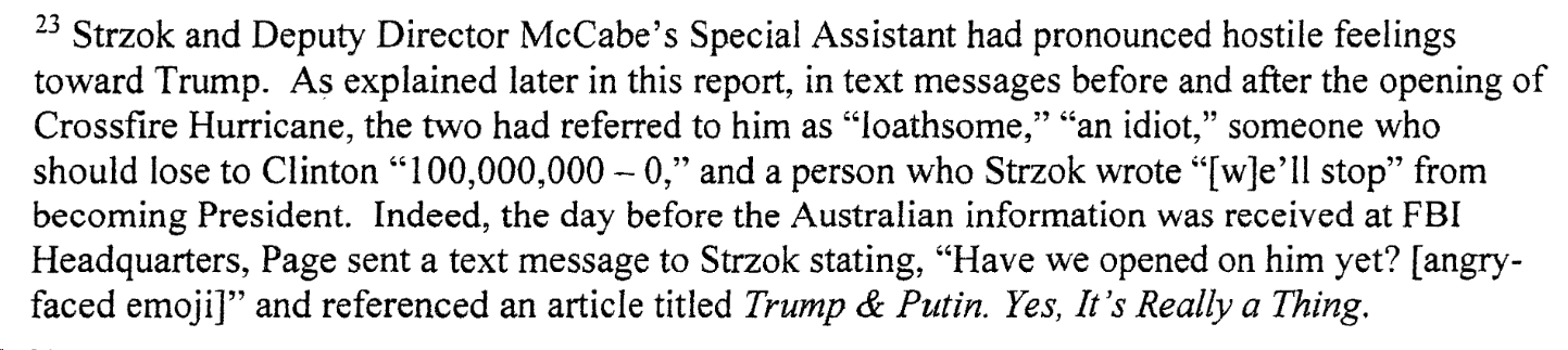 Along with the speed at which the investigation began, the report recounted that the FBI never briefed Trump or anyone in his 2016 campaign. (p.20)