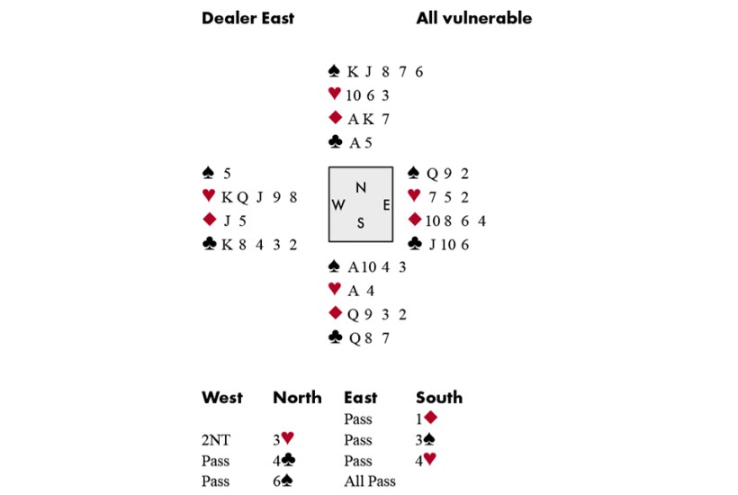 Lee and Waseem are not a regular partnership but they both have the same ethos and don’t mind an overbid – or two! Was (South) opened a quiet diamond and West’s 2NT showed hearts and clubs. Lee’s 3♥ promised spades which Was supported. 4♣ and 4♥ were cue bids and 6♠ said I think we’ve gone far enough, pard. The K♥ was led, which Waseem won in hand and guessed trumps correctly in view of the 2NT overcall. West continued with a third heart ruffed in hand and an amazing position arose: declarer played the Q♣ from hand which was covered by the king and won in dummy. Now he cashed all his winners, squeezing East who held J/10♣ and four diamonds, chalking up 12 tricks and 13 IMPs for his extremely happy team. No one else in the room bid slam and only one made 12 tricks – but he was in game. So – who do you think gave the game (in this case slam) away with their reckless overbidding? In my view, it was West with his shape-defining 2NT, virtually giving South a blueprint of how to play the hand. Good job, Was.