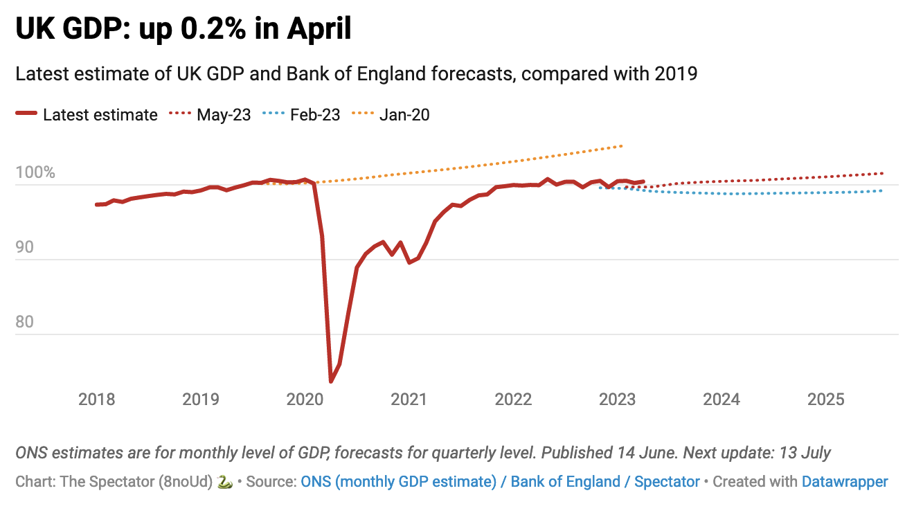 The economy grew by 0.2 per cent in April, following on from a confirmed 0.3 per cent contraction in March. This fits the trend this year of small ebbs and flows in GDP, which all together add up to extremely little overall growth this year. This is now what the big forecasters have predicted, from the Office for Budget Responsibility, to the OECD and IMF.