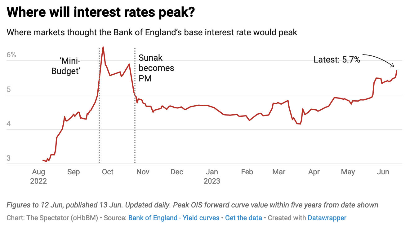 This morning’s figures underline expectations that the Bank of England will keep increasing the base rate until it hits about 5.5 per cent. So variable and new mortgages will become more expensive. One of the unique graphs we maintain in The Spectator’s data hub is how those expectations change over time. High inflation bedevils economics worldwide but the UK’s problems seem to be getting harder to remedy – hence the expectation that the Bank will have to jack up rates to a higher level than was envisaged a few months ago.