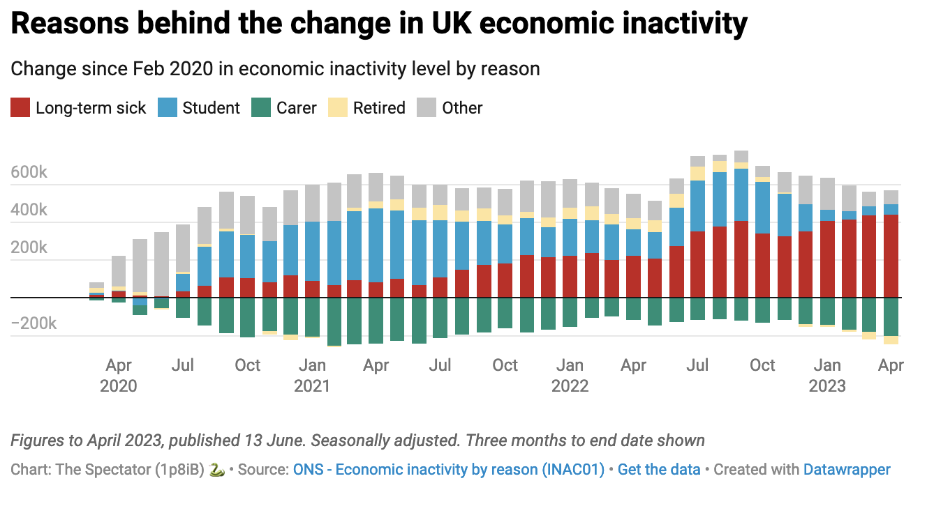 All together the three months to April saw another 140,000 people moving from economic inactivity (not in work or looking for it) and into the workforce. However, the proportion of those missing from the workforce due to long-term sickness continues to grow. It now stands at a record high of some 2.6 million people.