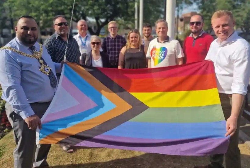 Take just one of the tensions thrown up during this ancient and most holy month of ‘Pride’. The mayor of Keighley, Mohammed Nazam, resigned this week after being criticised for attending a Pride event. Photographs show the then mayor grinning with a bunch of other numpties holding the hideous new ‘progress’ Pride flag, with added triangles to encompass trans people.