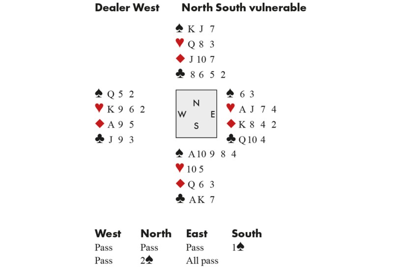 You arrive peacefully in 2♠️, and West leads the ♥️2 to East’s Jack. The first thing an expert would do is take a minute or five to consider who’s got what. OK, where’s the Queen of Spades? West led a small Heart so he has an honour, and it must be the King. Leading from Kxxx is not the most attractive and surely he would have preferred leading from two touching honours if he had them.