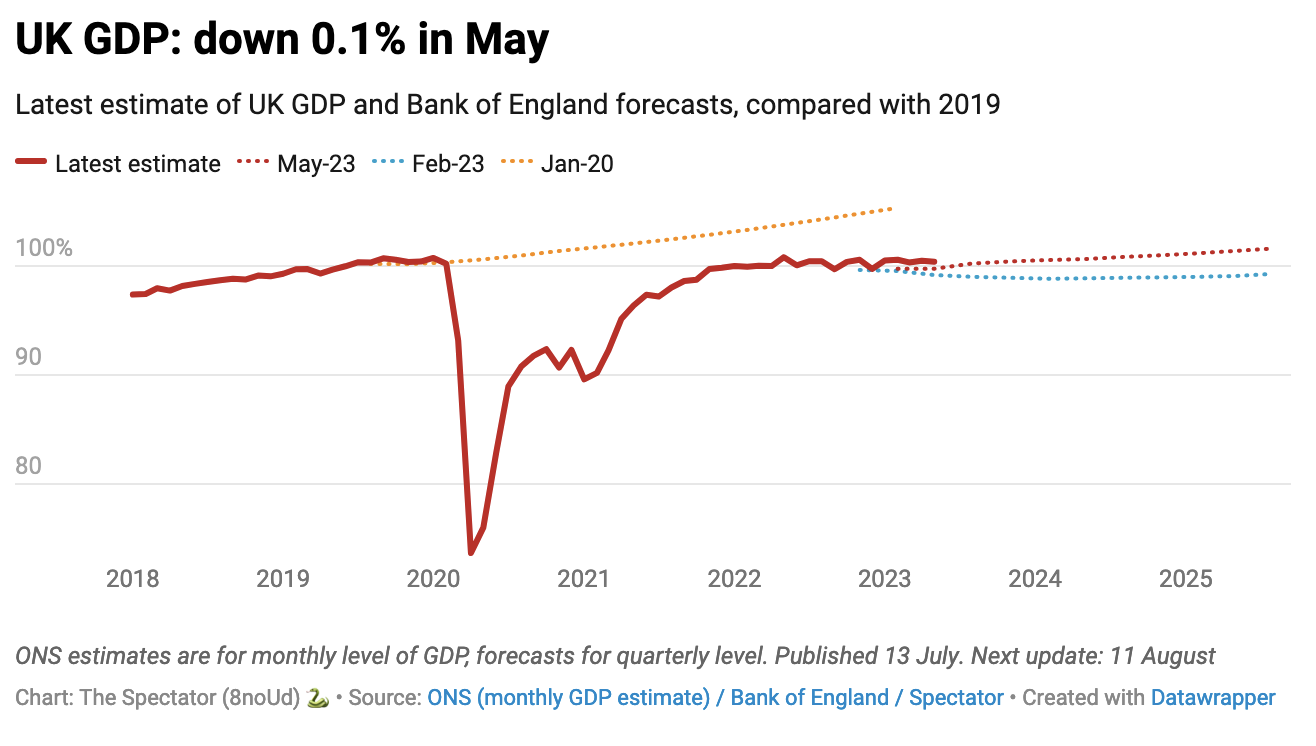The economy contracted by 0.1 per cent in May – down by 0.4 per cent compared to May 2022. But this dip is largely being attributed to the extra bank holiday for the King’s Coronation. This morning’s update from the Office for National Statistics shows some changes in behaviour due to this one-off occasion, including a fall in production of 0.6 per cent (the biggest contributor to the overall dip in GDP) but a 1.8 rise in arts, entertainment and recreation.