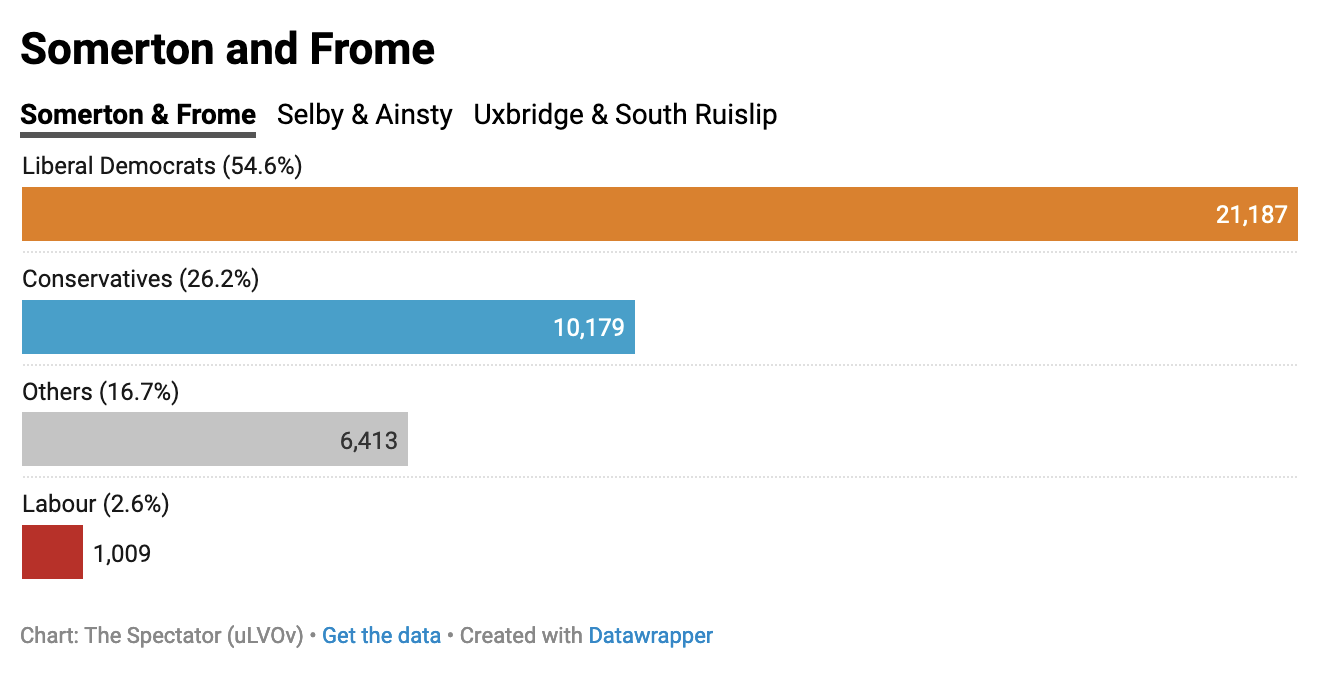 Rishi Sunak has narrowly avoided three by-election losses. Overnight, the Conservatives lost Somerton and Frome to the Liberal Democrats, overturning a majority of 19,213 to lead by 11,008 votes, and Selby and Ainsty to Labour, with Keir Starmer’s party overturning its largest ever majority at a by-election in post-war history. However, the Tories managed to narrowly cling on in Boris Johnson’s former seat of Uxbridge and South Ruislip, with a reduced majority of just 495 votes. It means tonight’s results are a mixed bag for Starmer and Sunak.