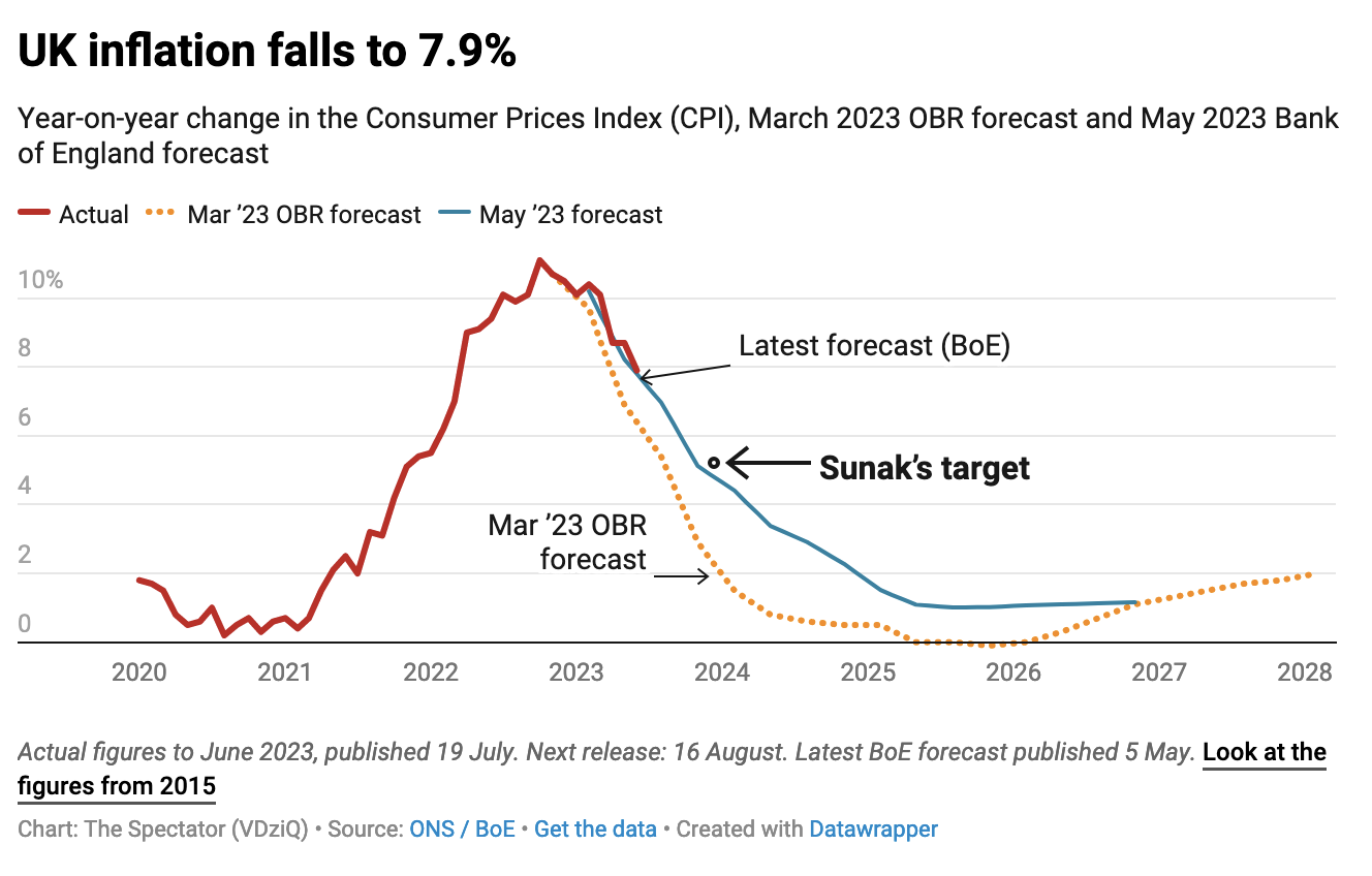 The rate of inflation has fallen again. CPI rose 7.9 per cent on the year in June, down from 8.7 per cent on the year in May. This takes the headline rate back to its lowest level since March last year – although it remains the highest across major economies.