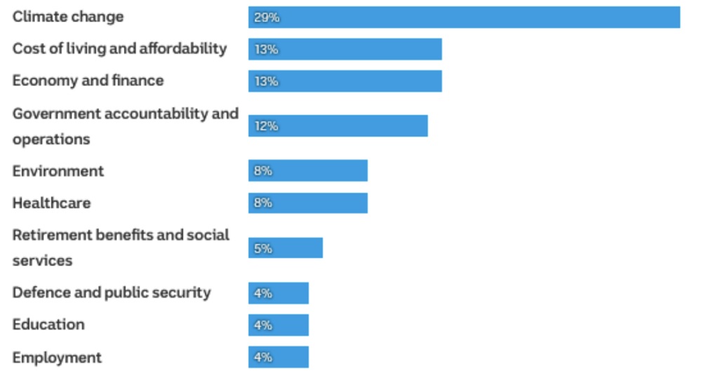 And, according to a cross-section of polling last year, for Australia, climate change (plus the environment) were the clear leader in concerns for 37 per cent of respondents.