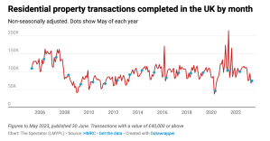 But what will happen if rates hit seven per cent, as some now think they might? That will give the market a further jolt. But even then anyone who is expecting prices suddenly to reset to 1990s, or even 2000s or 2019 levels, is likely to be disappointed. The housing slump is more likely to manifest itself in the form of a crash in volumes sooner rather than a crash in prices. According to HMRC, sales volumes have already tumbled by a third in the past year (from 99,760 in May 2022 to 74,360 in May 2023). Expect that to fall further before – if at all – we see a corresponding fall in sales prices.
