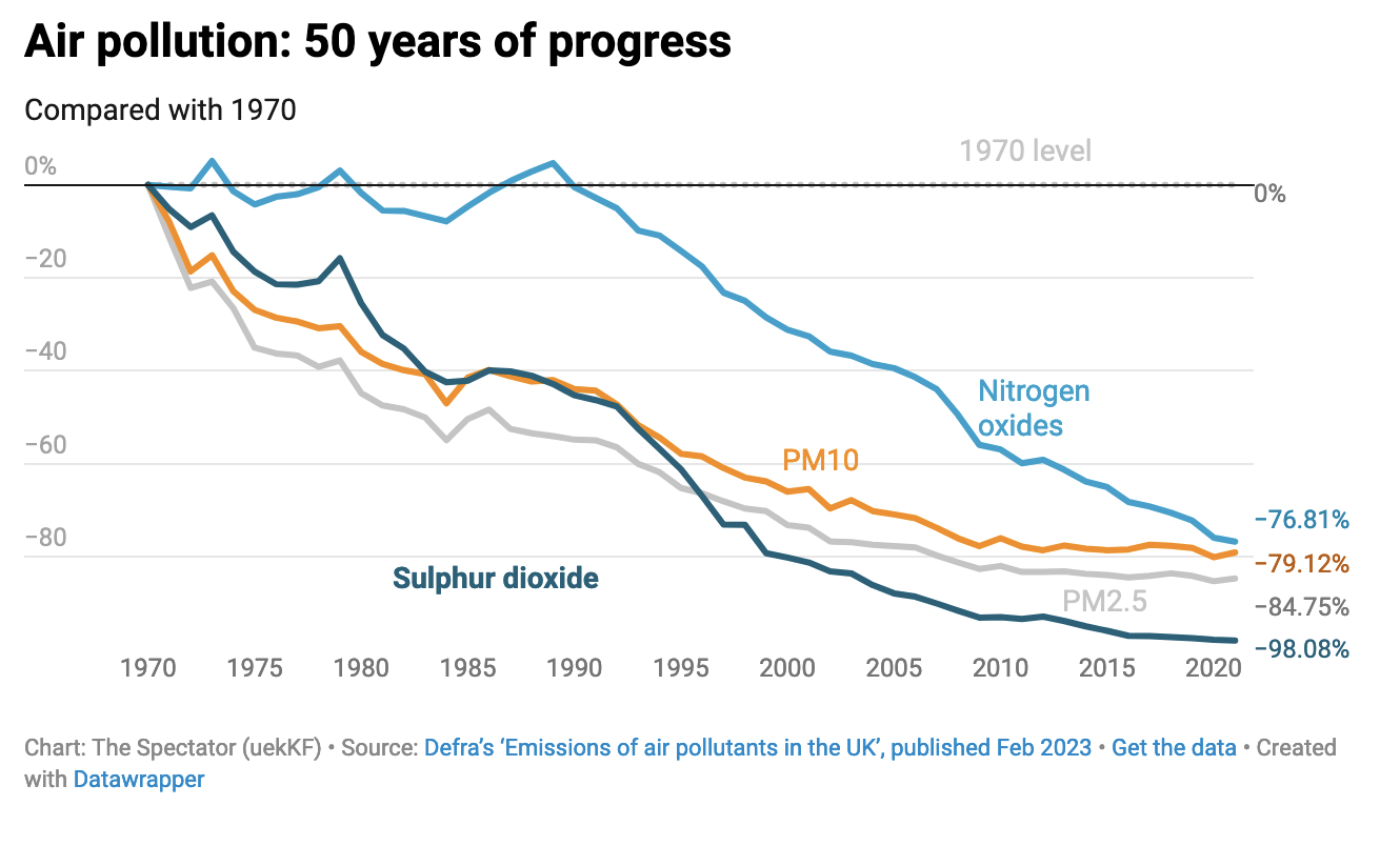 So when Sadiq Khan talks about ‘the air quality crisis’, people may ask: is this the same country where nitrogen oxide levels have fallen by 77 per cent, PM10 by 79 per cent, PM2.5 by 85 per cent and sulphur dioxide by 98 per cent – all in the Mayor’s lifetime? Has London’s air quality ever been better than it is now?