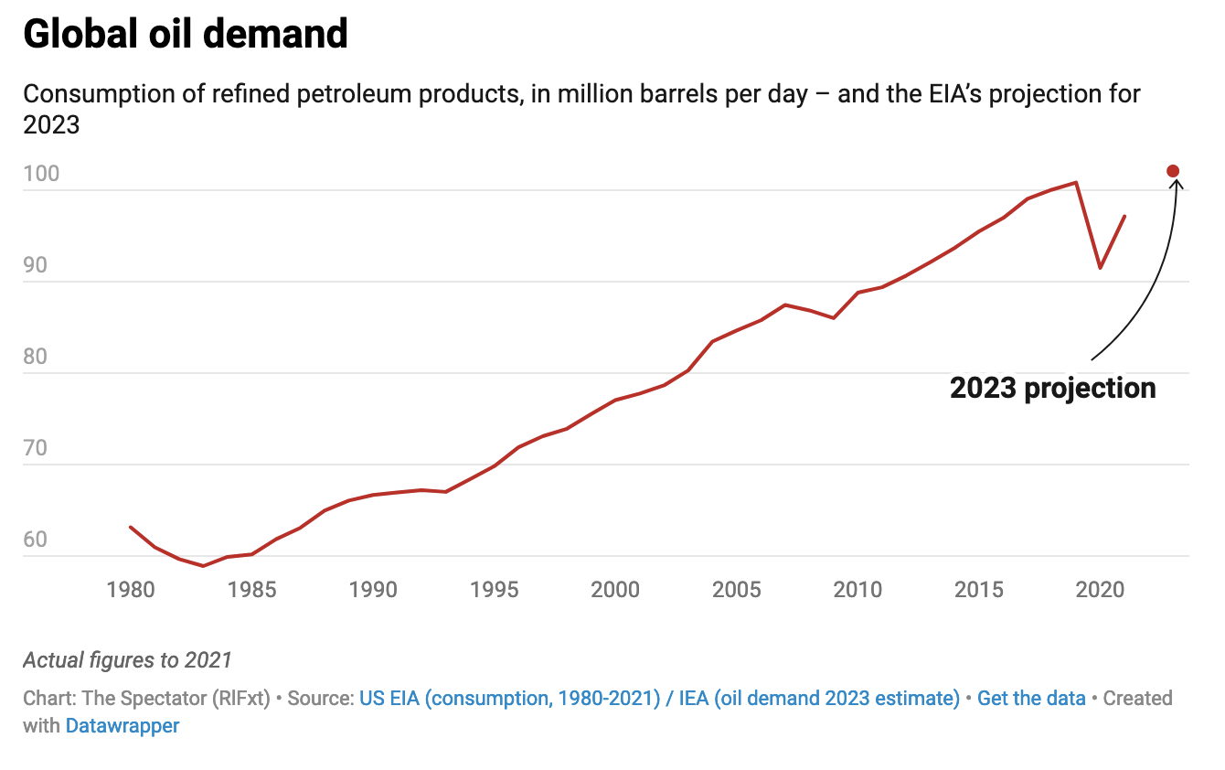 How is the thesis going? Not well. Not only did oil production fail to fall away after 2004-05, it seems to have recovered from its pandemic slump, too. In its latest Oil Report the International Energy Agency (IEA) projects that oil consumption over the course of 2023 will rise by 2.2 million barrels per day (mp/d) to reach 102.1 mb/d, overtaking 2019 and setting a new record. Oil production, too, is close to an all-time high, although a cut back by Saudi Arabia this month has taken the edge off the figures.