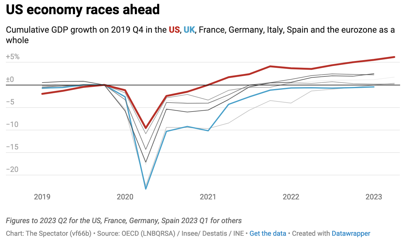 Every country that imposed a lockdown during the pandemic accepted that there would be an economic price to pay. But governments hoped that, on this measure, their own nation would fare better than others. The objective here was simple: don’t be the ugliest country of the bunch. Now, with some distance between those lockdowns and life today, we’re returning to a more established form of economic competition. Rather than focusing on whose economy looks particularly bad, the emphasis has returned to who is looking good. And on this metric, the United States is putting Europe – and Britain – to shame.