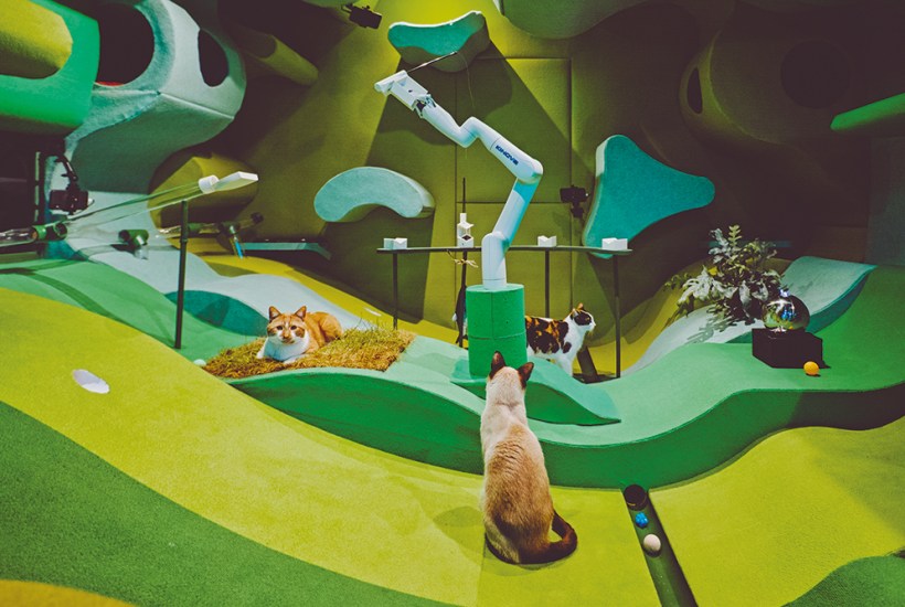 There’s a dystopic feel, too, to the futurist utopia imagined in artist collective Blast Theory’s film ‘Cat Royale’. The guinea pigs in this experiment in robotic pet-sitting are three cats, Ghostbuster, Pumpkin and Clover, filmed over several days being fed and entertained in a brightly coloured play environment by an AI robot arm. The arm puts down food, dangles strings, rolls balls and drags a blanket around. The string acts on the cats like catnip – they look seriously overstimulated – but the Small Dimpled Ball Ramp Roll game leaves Clover cold, lowering her happiness score by 1 per cent. My sympathies were with Pumpkin, whose happiness scores remained stubbornly low. Amusing as it is to watch, it’s not funny to think that similar systems of measurement are used on us. The chance to engage with a real robot is offered by Sprout, created by robotics studio Air Giants in the shape of a huge white, soft, interactive tongue which visitors are encouraged to touch and hug. When I touched it, it blushed a livid violet and leant into my space as if inviting me to tango; when a male visitor tickled it, it waggled with apparent excitement. But Sprout’s touchy-feeliness didn’t reassure me that humanity can ‘take collective ownership of the systems that feel beyond control’, as the show’s organisers hope, or that the spread of robotics is good for the planet. Wesley Goatley’s closing installation ‘Newly Forgotten Technologies’ is a dismal graveyard of discarded Alexas still winking pink, blue and green in the dark, their rare-earth minerals, millions of years in the making, returned to the Earth as smart trash in the blink of an eye. No such fate awaits the Fairlight, a collector’s item – but I wonder what became of Lisa.
