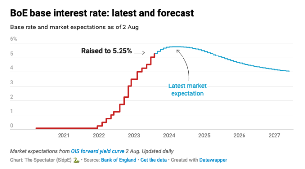 The Bank of England has raised the base rate yet again, this time to 5.25 per cent, a high not seen since April 2008. Like a child trapped in the back seat of a sweltering car, the response of many people will be: ‘Are we nearly there?’