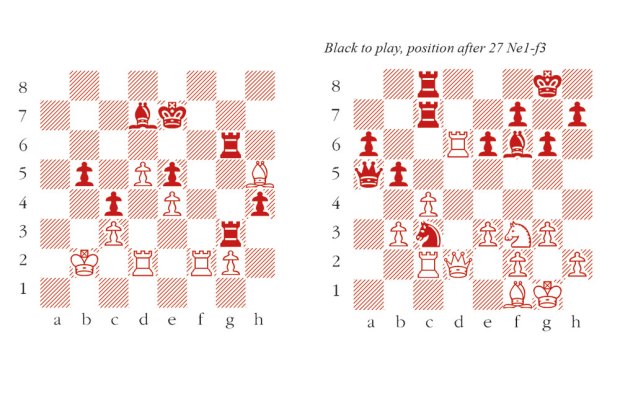 25…g5 26 Rxg5 fxg5 27 Nxg5+ Kg8 28 Nxe6 Rxe6 29 Rxe6 h5 30 Qe4 Bf7 31 Rh6 Be8 Black is hanging by a thread. 31…Re8! was the only good defence. After 32 Qh7+ Kf8 33 Qh8+ Bg8 it is surprising that White has no more than a draw. 32 Qd5+ The only way, with the point that 32…Qf7 33 Rg6+ wins. Rf7 33 Re6 Clever. Not 33 Rg6+ Kf8 34 Qg5 Rg7 and Black clings on. Bd7 34 Rg6+ Kf8 35 Qg5 Rf5 36 Rg8+ Kf7 37 Rg7+ Ke6 38 Qe7+ Black resigns