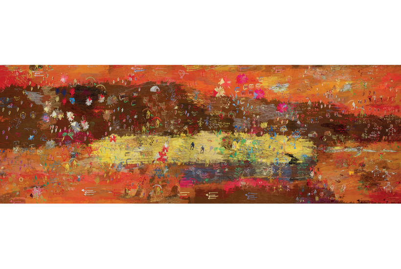 The imagery on Welsh-Ghanaian Anya Paintsil’s figurative rugs draws on a mix of West African folk tales and Celtic mythology: ‘We both fall over that’s the trick’ (2023) depicts Rhiannon from the Mabinogion, falsely accused of murdering and eating her infant son, then sentenced to carry strangers on her back for seven years. The interior of Lebanese artist Mounira Al Solh’s parasol-cum-tent ‘From Dawn to Dusk’ (2019) is embroidered with the ‘microhistories’ of Arab women, ancient and modern, who defied convention – from Sayyidah Aisha Bint Talha, wife of one of Mohammed’s companions, who went unveiled so people would recognise God’s grace in her beauty, to a Beirut housewife who, after her husband was killed for his politics, taught her sons to help in the kitchen and make their own beds. Of such things revolutions are made.