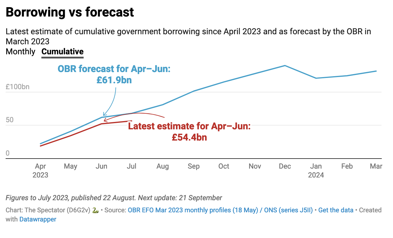 Still, there is fast talk of room for manoeuvre for Chancellor Jeremy Hunt to spend more or cut tax, as cumulative government borrowing continues to undershoot the Office for Budget Responsibility’s (OBR) latest forecast for the fiscal year. In July, borrowing reached £56.6 billion, £11.3 billion less than had been expected by this point.