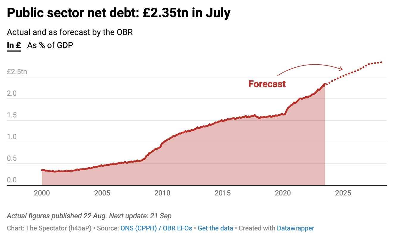 Today’s update reports the debt pile to be around £2.3 trillion, and it is expected to rise to around £2.5 trillion by the next parliament. Bloomberg this week reports that the debt pile has increased by a staggering 40 per cent since the pandemic, and it’s costing the UK more to service that debt right now than any other advanced economy.