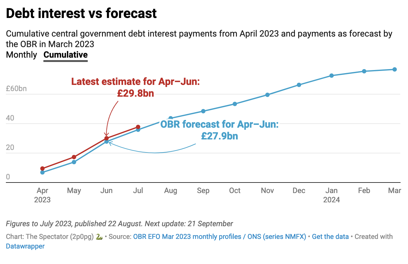 This is reflected in today’s figures, too: the interest payable on government debt hit £7.7 billion in July, £1.5 billion more than last year and also the highest cost of servicing government debt in any July on record. The amount it cost last month to pay off money already spent came in just shy of the OBR’s forecast, which predicted £8 billion. But the £0.3 billion difference is nothing to celebrate, as debt interest payments for the financial year so far are roughly £2 billion higher than forecast overall, amounting to £37.8 billion so far.