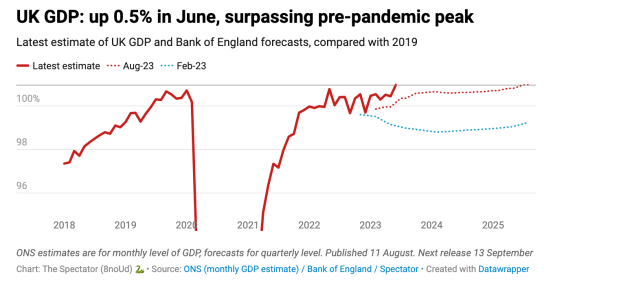 So the economy has defied the predictions of doom once more. The latest figures released by the Office for National Statistics (ONS) this morning show that the economy grew by 0.5 per cent in June, more than countering a 0.1 per cent fall in May, widely attributed to the extra bank holiday for the coronation.