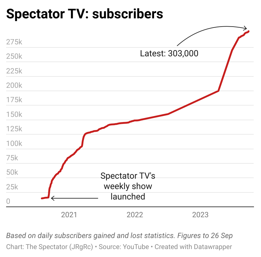 - And Spectator TV has now broken through 300,000 subscribers. The channel was launched during lockdown with cameras we found on eBay: the difference between the first episode and the latest is testimony to the professionalism of our five-person small broadcast team (who also produce our 14 podcasts).