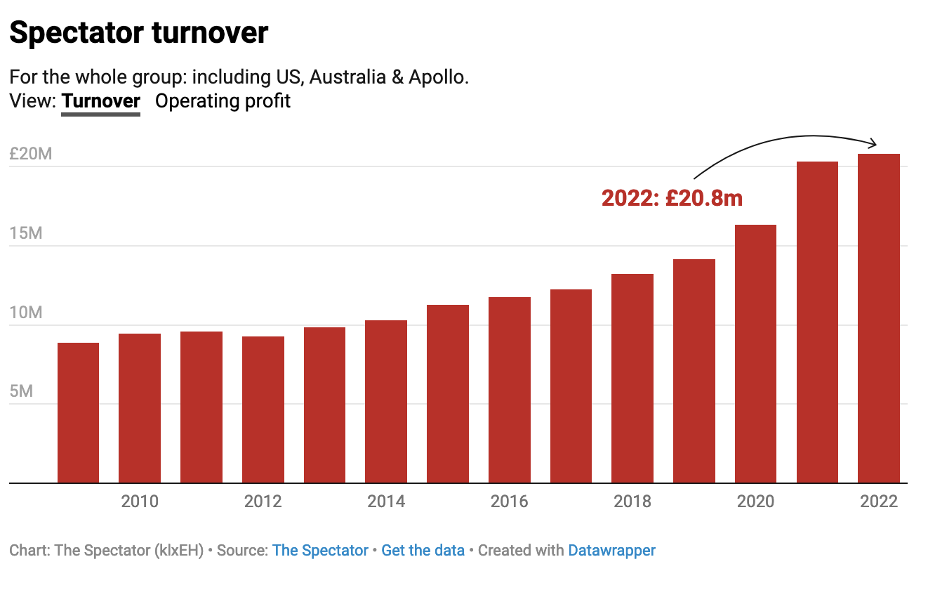 When I became editor in 2009, the industry was just starting a descent that would see magazine sales fall by more than two thirds over the decade. But subscriptions to The Spectator doubled – and so has our income. We surpassed £20 million in revenue last year, with UK profits of £4.8 million (up from £4.4 million the year before) on revenue of £18.4 million. We’ve been investing in our US expansion recently with its revenue up 35 per cent to £727,000. Taking everything – our investment in the US and Australia and Apollo, our sister fine art magazine – group profits were a robust £2.6 million.