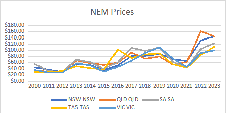 As a result, we see prices forced down as the coal generators meet the market pressures from wind and solar that will seek to run at anything over its (subsidised) break-even of about $50 per MWh. Prices then shoot up when those distorted market pressures add costs (by forcing the capital-intensive coal plant to operate part-time) and at the same time squeeze prices. That process forces a facility to close once a new lick of new capital is required to supply – not at the steady rate of the original design – but as a filler for when lack of wind and sun prevent intermittent renewables from generating. The pattern can be observed in prices depicted below.
